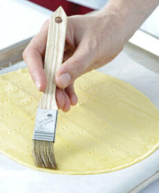 Punzecchia la parte interna della sfoglia, spennella il bordo con un po' di sciroppo preparato con poca acqua e zucchero e cuoci in forno già caldo a 200° per 15-20 minuti, finché la sfoglia sarà dorata.