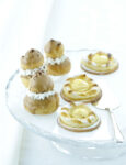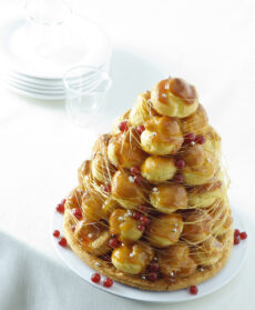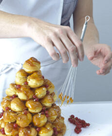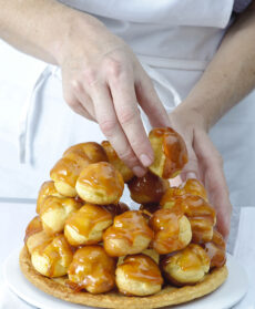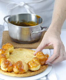 Fai caramellare il rimanente zucchero. Metti il disco di sfoglia su un piatto da dolci e forma all'interno del bordo una corona di bignè, immergendo prima i lati nel caramello, in modo che si cementino.