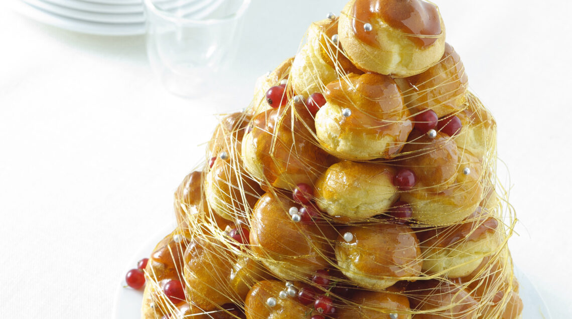 Forma un secondo giro di bignè e continua così dando man mano al dolce una forma a cono; termina con un solo bignè, inserisci qua e là chicchi di ribes e confettini d'argento.