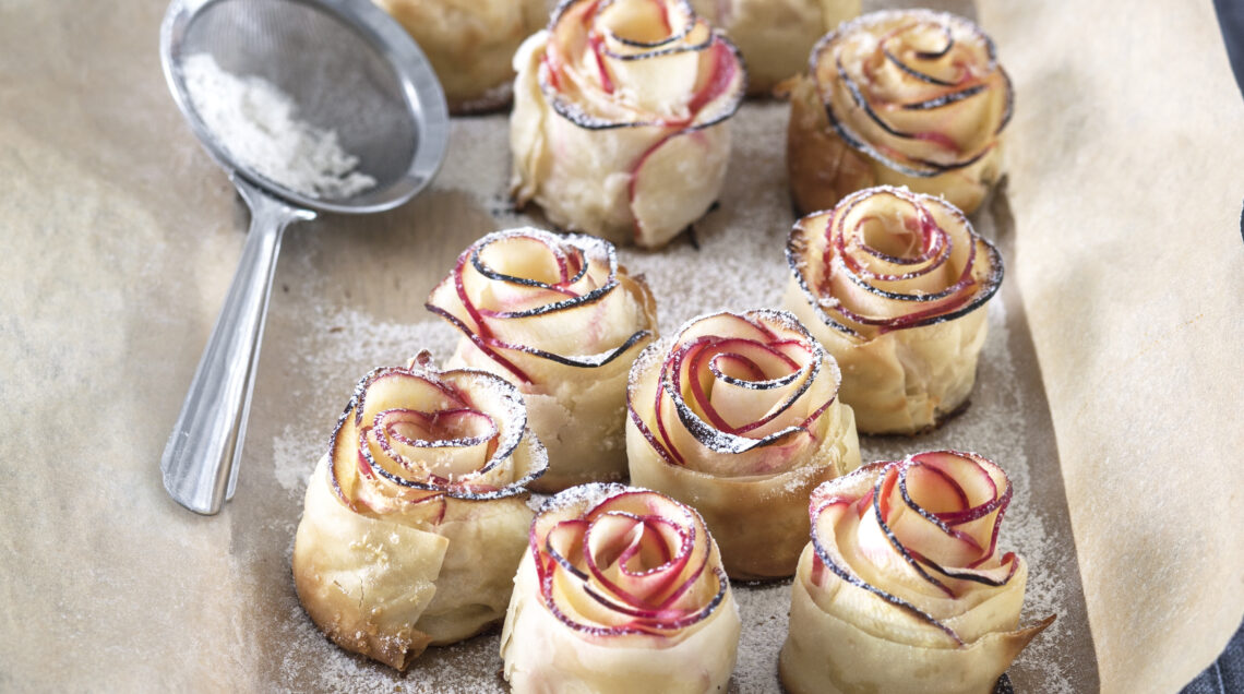 3 Arrotolate la striscia farcita, leggermente inumidita per farla aderire. Proseguite fino a esaurire strisce e mele. Allineate le rose su una placca rivestita di carta da forno e cuocete a 200° per 5 minuti.