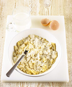 Con la punta delle dita incorporate il burro alla farina per ottenere una consistenza simile alle briciole. Aggiungete il latte e poi l'uovo intero, sbattendo il composto con la frusta.