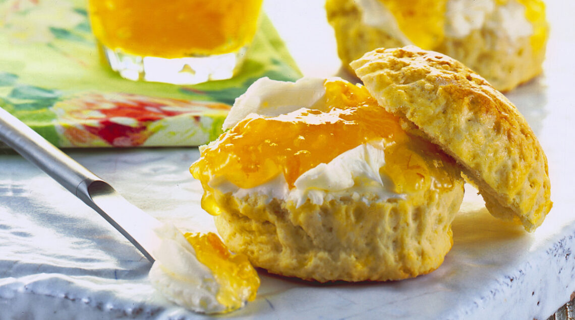 Mescolate il tuorlo con un cucchiaino di zucchero, spennellate gli scones e cuoceteli in forno a 220° per 12 minuti circa, finché risultano dorati in superficie. Serviteli subito con il burro e la marmellata di arance.