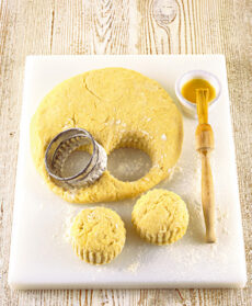 Lavorate l'impasto sul piano di lavoro e stendetelo con le mani in modo che abbia uno spessore di circa 3 centimetri. Ritagliatelo con il tagliapasta tondo di 5 centimetri e mettete i dischi sulla teglia foderata di carta forno.