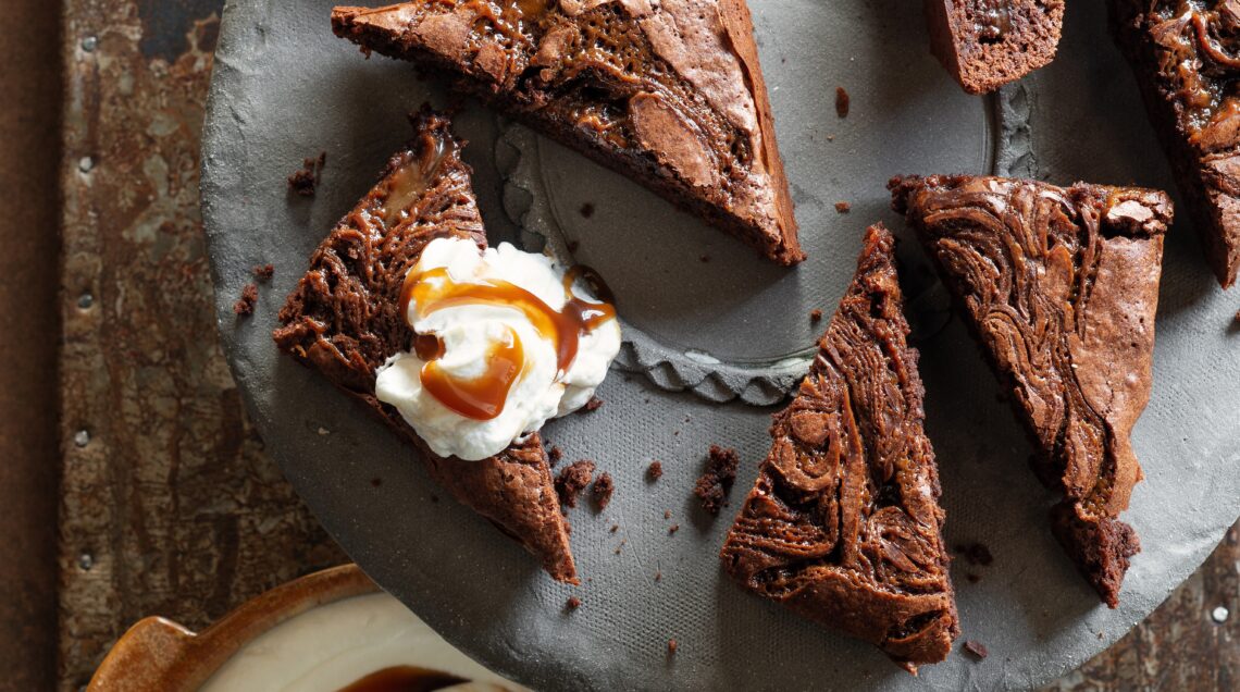 3) Versate il composto in uno stampo rettangolare da 22x18 cm ricoperto con carta da forno e livellatelo con una spatola. Distribuite a cucchiaiate il caramello al whisky e poi create un effetto marmorizzato con l'aiuto di uno stecchino. Infornate per circa 20 minuti; lasciate raffreddare completamente e poi tagliate il dolce in circa 12 triangoli.