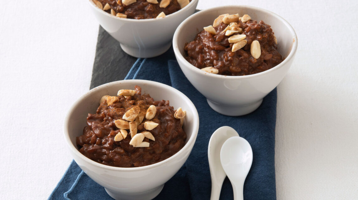 3) Quando il riso avrà assorbito tutto il liquido (ci vogliono 15 minuti circa), incorporate la crema al cacao e proseguite la cottura per pochi minuti finché il riso sarà tenero, mescolando bene. Eliminate la scorza di arancia, suddividete il riso in coppette individuali e servitelo tiepido o freddo spolverizzato con le mandorle e un po’ di cannella.