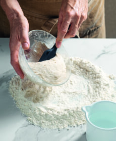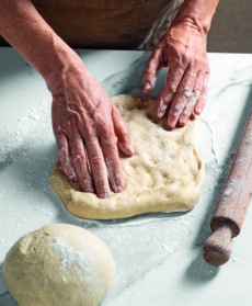 Sbriciolate il lievito e stemperatelo in poca acqua tiepida. Unite un paio di manciate di farina e un pizzico di zucchero e formate un piccolo panetto; mettetelo in una ciotola, coprite con un foglio di pellicola e lasciatelo riposare per mezz'ora in un luogo tiepido. Formate con il resto della farina una fontana, versate al centro il panetto e altra acqua a temperatura ambiente (circa 220 ml) e lavorate fino a ottenere un impasto elastico. Trasferitelo in una grossa ciotola, coprite con pellicola e fate lievitare fino a farlo raddoppiare di volume (circa 2-3 ore).