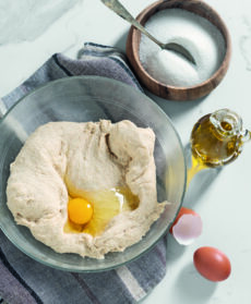 Riprendete la pasta e incorporatevi le uova sgusciate, 150 ml di olio, 100 g di zucchero e un pizzico di sale: lavorate a lungo, finché l'impasto non risulterà più appiccicoso (unite pochissima altra farina, solo se necessario). Mettete nuovamente l'impasto nella ciotola e fatelo lievitare ancora fino al raddoppio del volume (circa 2 ore). Mettete i semi di anice in una ciotolina e bagnateli con il vino.