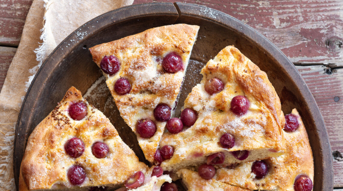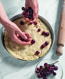 Stendete anche la seconda porzione di pasta e adagiatela sulla prima, sigillando i bordi con le dita. Affondate nella pasta gli acini d'uva rimasti premendoli leggermente nell'impasto.