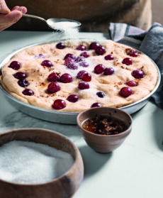 Distribuite metà degli acini di uva, affondandoli un po' nell'impasto, e spolverizzate metà dello zucchero rimasto sulla superficie della schiacciata.
