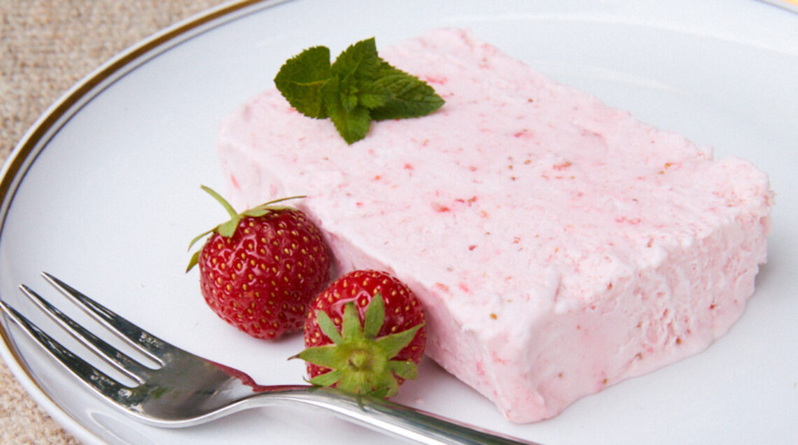 A base di panna, questo dolce è un semifreddo arricchito con fragole, rinfrescante e colorato. Adatto da gustare in estate