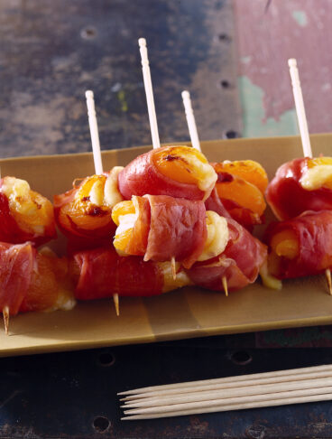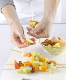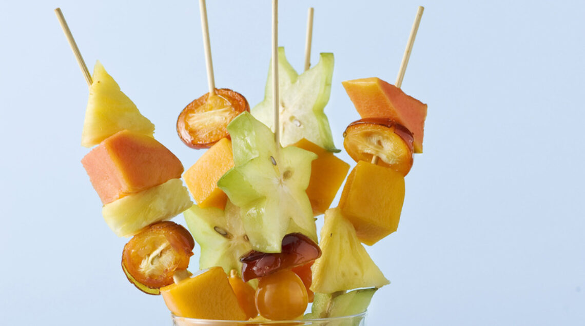 Alternate i diversi frutti su 8 lunghi spiedini di legno, sistemateli in un bicchierone e serviteli.
