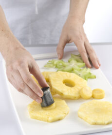 Tagliare ananas e carambola. Affettate una carambola in modo da ottenere 8 stelline; con un piccolo tagliabiscotti