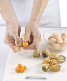 Preparare i frutti più piccoli. Sbucciate 8 litchi e tagliateli a metà togliendo il nocciolo. Aprite le foglie di 4 alchechengi ed eliminatele. Lavate bene e asciugate i kumquat, poi tagliateli a quarti (o a metà se sono molto piccoli).