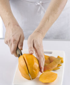 Tagliare mango e papaia. Sbucciate un mango e tagliate la polpa rasente al nocciolo, poi riducetela a fette spesse un cm, quindi a dadini. Sbucciate mezza papaia, eliminate la parte con i semini neri e tagliate la polpa a tocchetti.