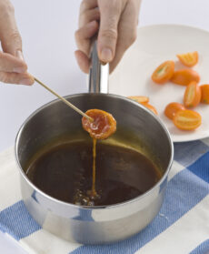 Preparare gli spiedini. Fate caramellare 4 cucchiai di zucchero con un cucchiaio di acqua in una casseruolina a fondo spesso, immergete nel caramello caldo i kumquat infilzati su uno stecchino e fateli asciugare su carta da forno.