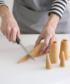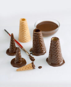 Intingete completamente nel cioccolato fondente le 8 parti dei coni. Formate 4 dischetti di cioccolato fuso spesso 3 mm con diametro doppio rispetto alla base delle punte, facendolo colare da un cucchiaio su un foglio di carta da forno.