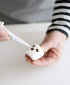 Posizionate subito al centro le punte di cono. Create 4 dischetti più grandi e fissatevi i tronchi di cono. Posizionate sui tronchi un marshmallow e appoggiate sopra i "cappellini". Mettete un po' di cioccolato fuso in una sac a poche e disegnate gli occhi ed il naso delle streghette. Allo stesso modo tracciate la bocca con il cioccolato bianco tinto con il colorante.