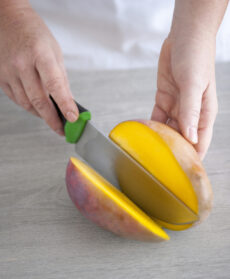 Lavate il mango e la papaia e asciugateli. Tagliate la polpa del primo intorno al nocciolo, pelatelo e riducetelo a lamelle sottili.