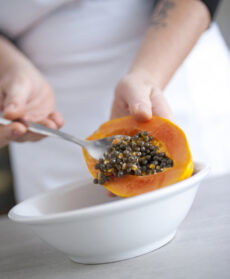 Tagliate la papaia a metà ed eliminate i semini con un cucchiaio.