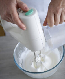 Preparate la meringa. Pesate gli albumi e pesate lo stesso quantitativo (circa 120 g) dello zucchero rimasto. Montate gli albumi con un paio di fruste elettriche aggiungendo man mano lo zucchero, fino a ottenere una meringa lucida e soda.