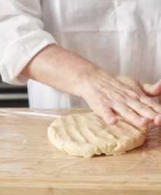Quando la pasta sarà fredda e compatta, premetela con le mani sul piano di lavoro, stendetela tra due fogli di carta da forno con l’aiuto di un mattarello e formate un disco di 30-32 cm di diametro.