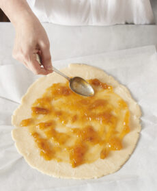 Trasferitelo sulla placca da forno, tenendo sotto il foglio di carta da forno, e spalmate la superficie con la confettura lasciando libero un bordo di circa 5 cm.