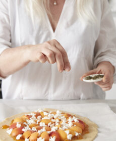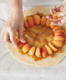 Questa tarte di albicocche è una crostata rustica, con una base di pasta brisée al farro, lievemente zuccherata. La farcitura di albicocche stempera la dolcezza grazie alla feta, il sapido formaggio greco sbriciolato sul ripieno. E, soprattutto, grazie alla fragranza del pepe nero e del timo essiccato, che sposano benissimo la frutta. Il tutto è rinfrescato da una cucchiaiata di crème fraîche, ovvero panna acida, con un tocco di miele.