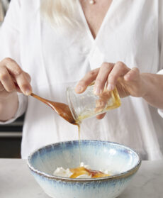 Nel frattempo, mettete la creme fraîche in una ciotola, unite il miele e mescolate bene. Una volta raffreddata servite la tarte accompagnata da una cucchiaiata di creme fraîche al miele.