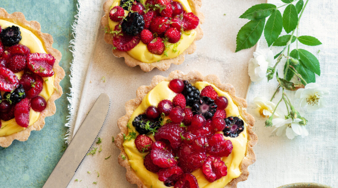 4 Lasciate raffreddare le basi di frolla, poi farcitele con la crema al lime preparata e guarnitele con i frutti di bosco misti lavati e asciugati con carta assorbente da cucina. Completate, a piacere, con una grattugiata di scorza di lime.