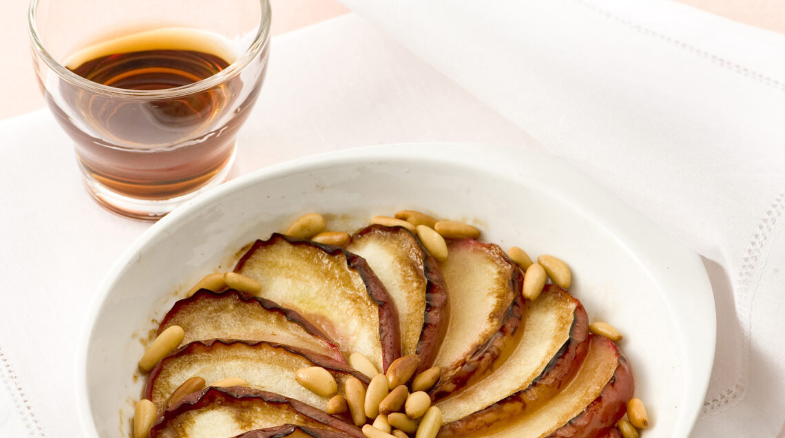 2) Cospargi gli spicchi con un velo di zucchero, qualche fiocchetto di burro ed un cucchiaio di pinoli. Spruzzali con un bicchierino di rum.
