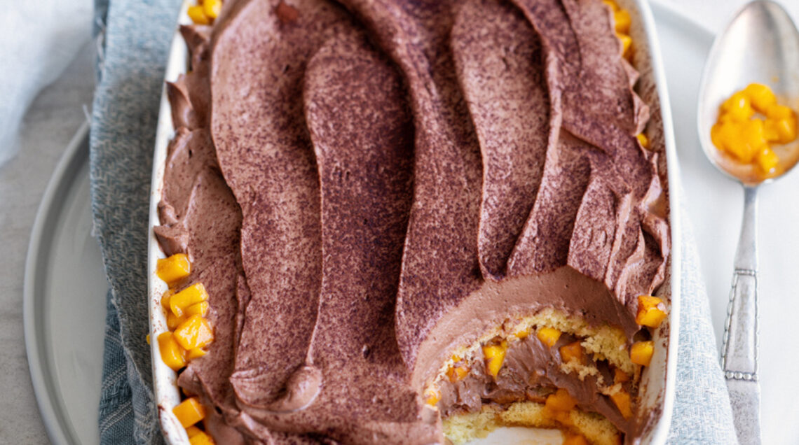 Una versione più estiva e gustosa del tiramisù? Quella al cioccolato con mango e succo misto di frutti esotici