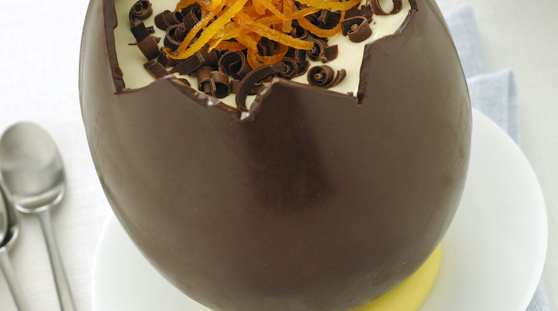 3 Profumate il succo ricavato da 3 arance con il liquore all'arancia rimasto. Intanto versate uno strato di crema sul fondo dell'uovo. Disponete sulla crema uno strato di savoiardi inumiditi, uno alla volta, su entrambi i lati, con il succo delle arance profumato. Proseguite, alternando crema e savoiardi. Terminate il dolce con uno strato di crema spolverizzata con piccolissimi riccioli di cioccolato ricavati con un pelapatate dalla calotta asportata. Aggiungete al centro dell'uovo le listarelle di scorze d'arancia cotte e sgocciolate.