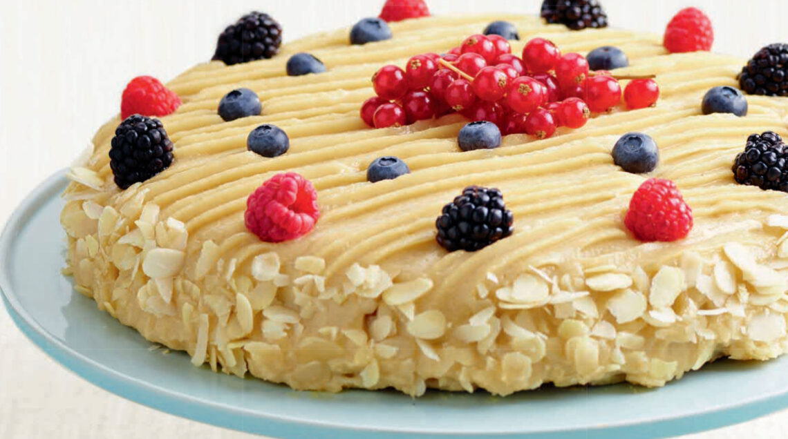 7) Decora la superficie con la crema di mandorle, spalmandola anche sui bordi. Rivesti questi ultimi con le mandorle edecora con i frutti di bosco.