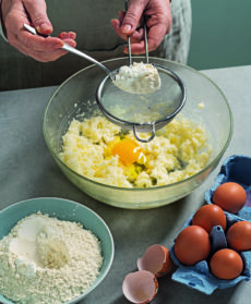 Montate il burro molto morbido con lo zucchero fino a ottenere un composto spumoso; unite le uova sgusciate, uno alla volta, alternandole con la farina setacciata con il lievito e amalgamate.