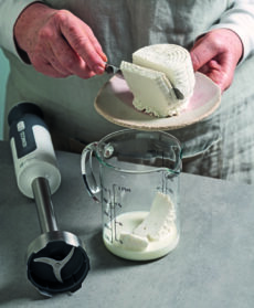 Frullate la ricotta di capra con il latte fino a ottenere un composto omogeneo. Amalgamatelo all'impasto con la scorza grattugiata del limone e 50 ml di succo.