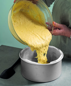 Versate l'impasto in uno stampo rotondo da 20 cm di diametro rivestito con un foglio di carta da forno e cuocete la torta in forno a 180° per circa 40 minuti.