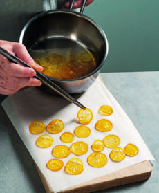 Lavate intanto i limoni per il decoro, asciugateli e tagliateli a fettine da 2 mm di spessore; scaldate lo zucchero in una casseruola con 200 ml di acqua, portate a ebollizione, unite le fette di limone e cuocetele su fiamma dolce fino a quando diventano trasparenti. Lasciatele raffreddare nel loro sciroppo; poi scolatele aiutandovi con una pinza e trasferitele su un foglio di carta da forno.