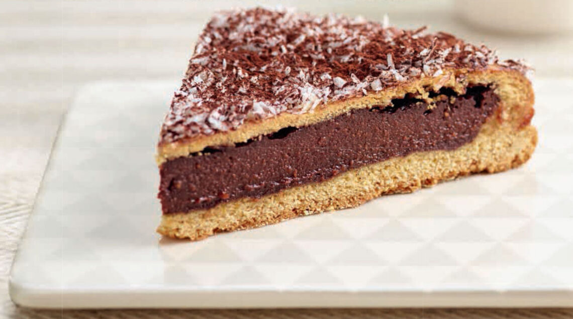 3) Dividi l'impasto in due parti (2/3 e 1/3). Stendi la più grande a 2 mm di spessore e trasferiscila in uno stampo (circa 28 cm) oliato e infarinato. Versa la crema di cacao, stendi la pasta rimasta, copri il ripieno e sigilla. Bucherella con una forchetta e inforna a 200° C per 20 minuti.