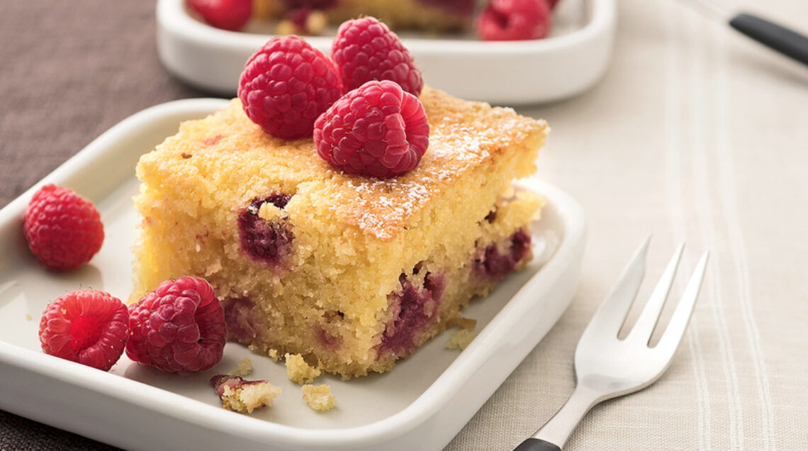 4 Sfornate, fate raffreddare il dolce nello stampo, staccate i bordi con un coltellino, sformatelo e spolverizzatelo con lo zucchero a velo. Tagliatelo a quadrotti e servitelo con i lamponi rimasti. Se vi piace, potete accompagnarlo con 1 cucchiaio di panna montata.