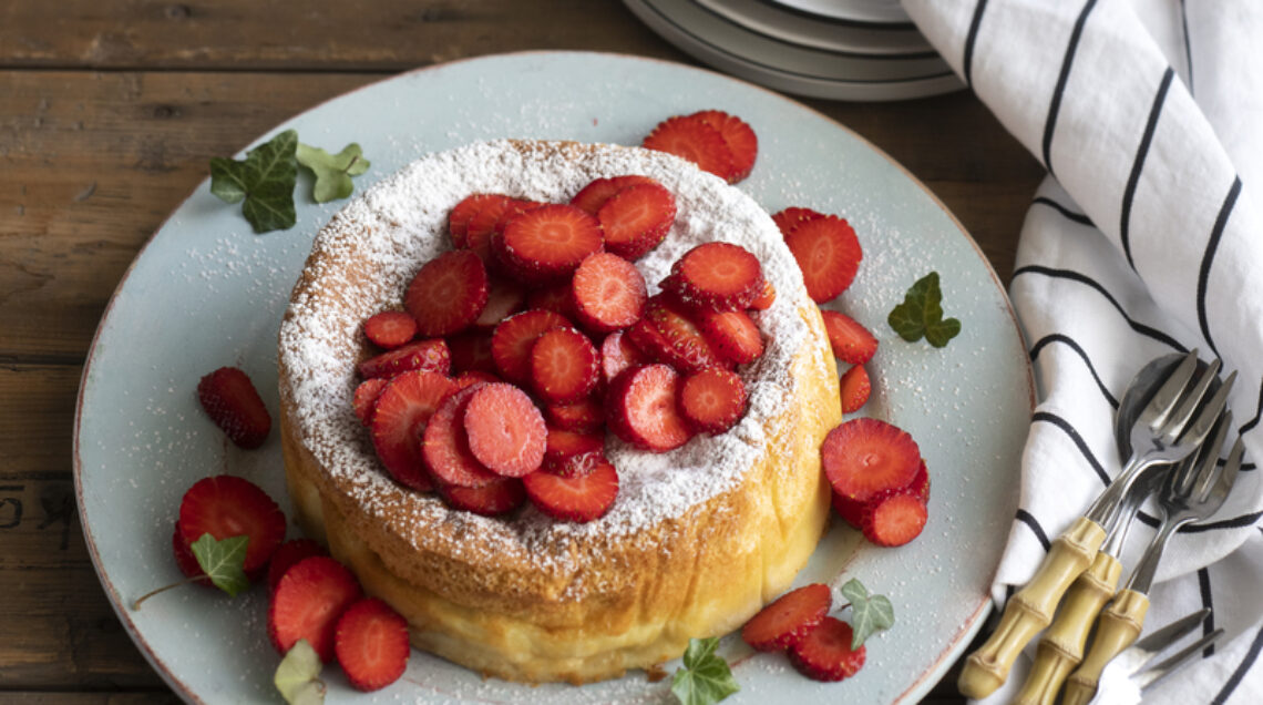 3) Incorporate delicatamente gli albumi montati a neve; versate il composto (piuttosto liquido) in uno stampo da 22 cm di diametro imburrato e infornate a 160° circa 1 ora finché risulta dorato. Sfornate e fate riposare 3 ore. Completate con le fragole a fettine e lo zucchero a velo.