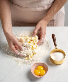 Frullate nel mixer la farina con 185 g di burro freddo a pezzetti fino a ottenere un composto a briciole. Unite i tuorli leggermente sbattuti, 125 g di zucchero a velo e il sale e lavorate ancora qualche istante. Impastate il composto velocemente con le mani e formate una palla. Avvolgetela nella pellicola e fatela riposare in frigo per un'ora.