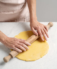 Stendete la pasta con il matterello sul piano infarinato in un disco di 5-6 mm di spessore.