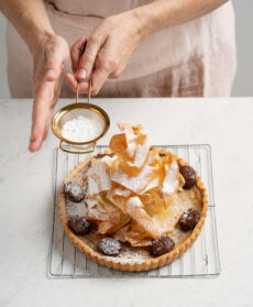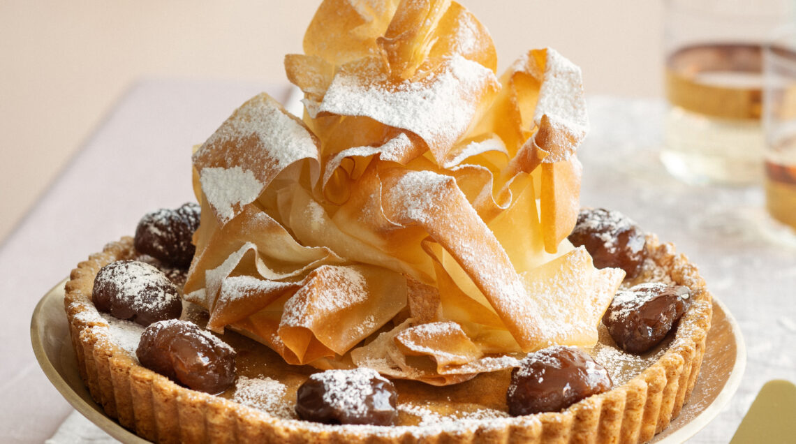 Una torta a base di frolla, con una ricca farcitura di crema di marroni che profuma di whisky. Il tocco finale spetta alla decorazione di pasta fillo. Una nevicata di zucchero a velo e il dolce è pronto per stupire amici e familiari