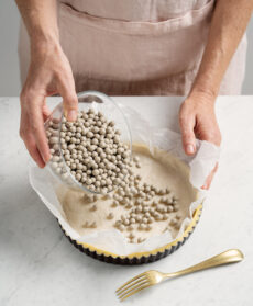 Trasferite il disco di pasta in uno stampo da crostata con il fondo removibile da 24 cm di diametro, punzecchiate la pasta con i rebbi di una forchetta e trasferite ancora in frigo per 20 minuti; poi coprite la pasta con un foglio di carta da forno bagnato e strizzato e riempite con abbondanti palline di porcellana. Infornate a 180° per 20 minuti, quindi eliminate il foglio con le palline e cuocete ancora 5 minuti.