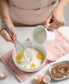 Preparate la farcitura: sbattete le uova con lo zucchero, quindi incorporate la crema di marroni ammorbidita con il whisky, il latte e la panna.