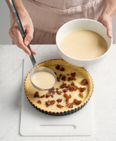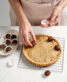 Sbriciolate 4 marron glacé e distribuiteli sulla frolla, versate il composto di uova e infornate a 160° per 30 minuti. Sfornate e fate raffreddare.