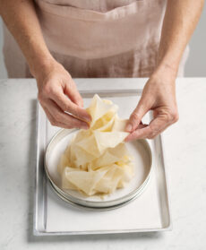 Tagliate i fogli di pasta fillo in larghe strisce e spennellateli con poco burro fuso. Sistemateli in una teglia in modo da formare una "montagna" e infornate a 180° per 10 minuti.