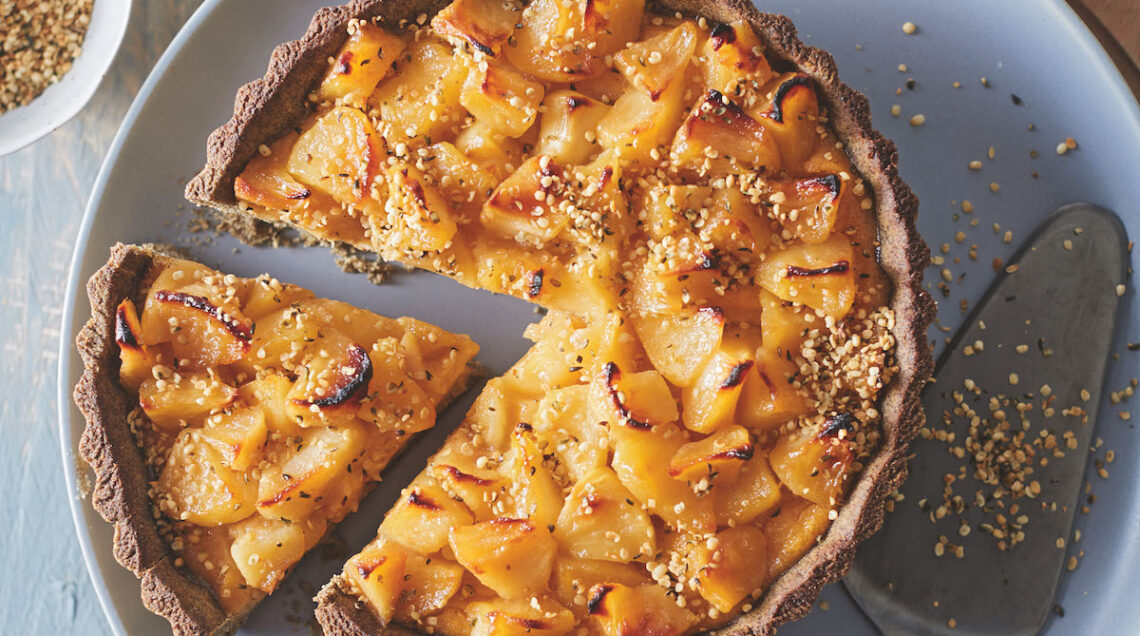 3 Stendete la frolla e disponetela in una teglia di 24 cm di diametro foderata con carta da forno. Versate la crema di frutta tiepida sul fondo. Unite la composta di mele tiepida e infornate a 180° per 50 minuti: fate dorare le punte delle mele con il grill. Lasciate raffreddare la crostata e sformatela. Completate con i semi di canapa tostati in un padellino.