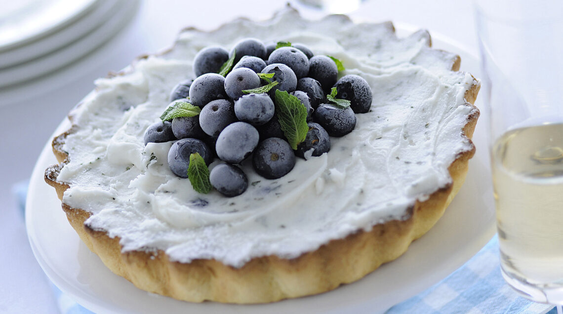 3) Completa e servi. Unisci al gelato allo yogurt ammorbidito 5-6 foglie di menta tritate e mescola. Trasferisci il composto sui mirtilli e spalmalo delicatamente, aiutandoti con una spatola. Disponi la crostata in freezer per 20 minuti. Sforma la torta in un piatto da portata, eliminando la carta da forno, decora il centro con i mirtilli rimasti, qualche foglia di menta spezzettata e poco zucchero a velo e servi.