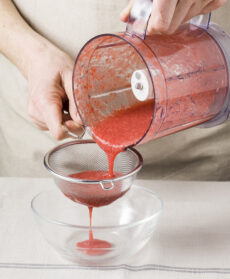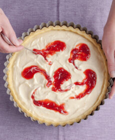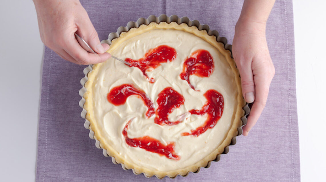 Per ottenere un buon effetto, la variegatura deve restare in superficie: tirate la salsa di lampone delicatamente in modo che non affondi troppo nella crema.